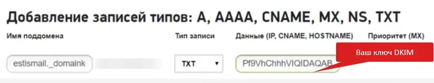 - Добавление ключа на ваш домен, происходит в настройках вашего домена. Вам необходимо добавить новую запись TXT и уже в нее поместить ключ. При добавлении, укажите следующие значения: