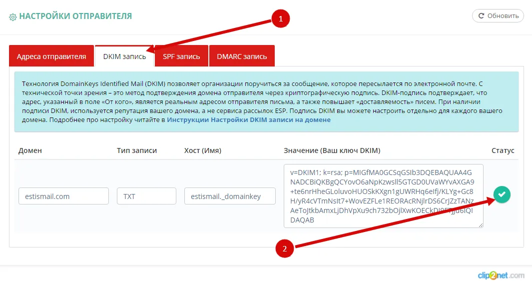 Если вы все сделаете правильно, то в разделе "Настройки отправителя" во вкладке "DKIM" вы увидите статус "Активный"