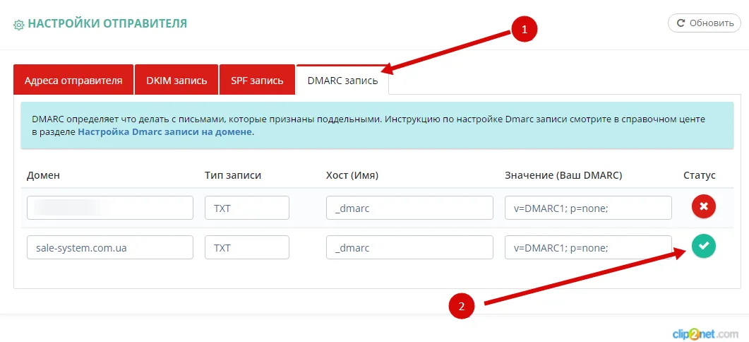 Мы постоянно сканируем домены наших пользователей и выводи информацию в ваш аккаунт. Если вы правильно прописали DMARC запись, в вашем домене, в разделе "Настройки отправителя" во вкладке "Dmarc" вы увидите статус "Активный".