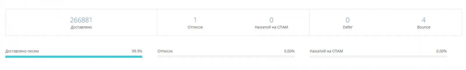 В нашем случае результат радует. Практически 100% писем попали в почтовый ящик получателей. Но есть 2 пункта, которые показывают сколько писем потерялись в дороге и не были доставлены адресатам: Defer и Bounce.