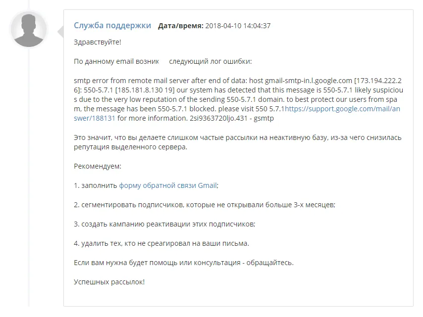 На первый взгляд кажется, что это сложно. Но не бойтесь обращаться в службу поддержки почтовых провайдеров. Там работают люди, которые тоже ошибаются. Не позволяйте чужой ошибке лишить вас возможности делать рассылки.