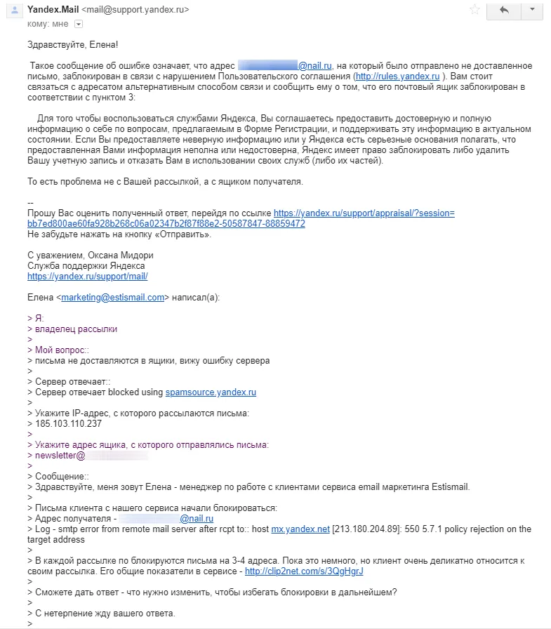 Чтобы корректно заполнить форму обратной связи, запросите у Estismail информацию об ошибке, предоставив дату и время рассылки, характер проблемы, узнайте IP сервера отправки. Пример переписки нашего менеджера с поддержкой Яндекс: