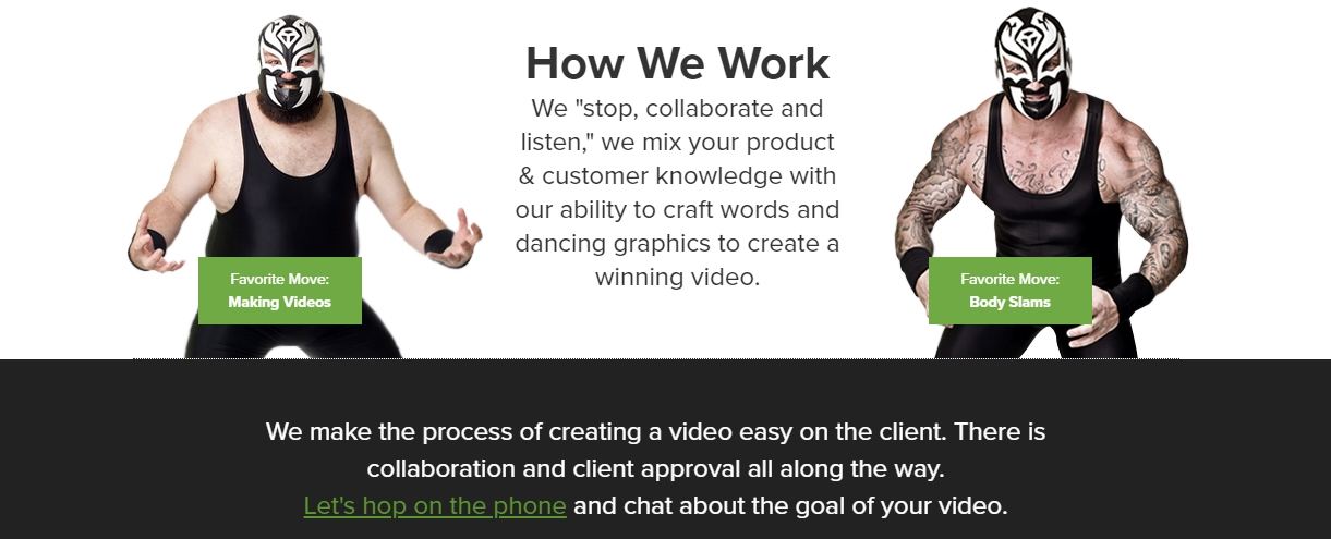 Что может находиться на странице “Познакомься с командой” у компании по производству видео? Конечно юморной короткий видеоролик. К нему прилагаются фотографии боссов и краткий список фактов, которые объединяют команду - любовь к тако, путешествиям по миру и карате. Но если пролистаете весь сайт, на каждой странице найдете интересную информацию “о нас”.