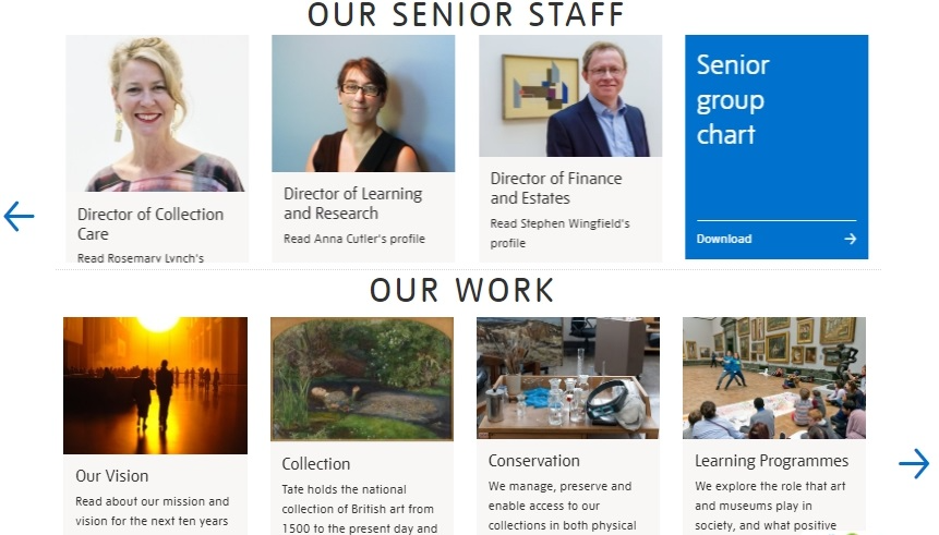 На странице “О нас” можно найти все - историю и расовую политику, управление и влияние коронавируса на работу Tate, отчеты и вакансии. И много другого контента. Но не пугайтесь такого количества информации. Как и в предыдущем случае, она логично разделена на вкладки с изображением, названием и кратким описанием.