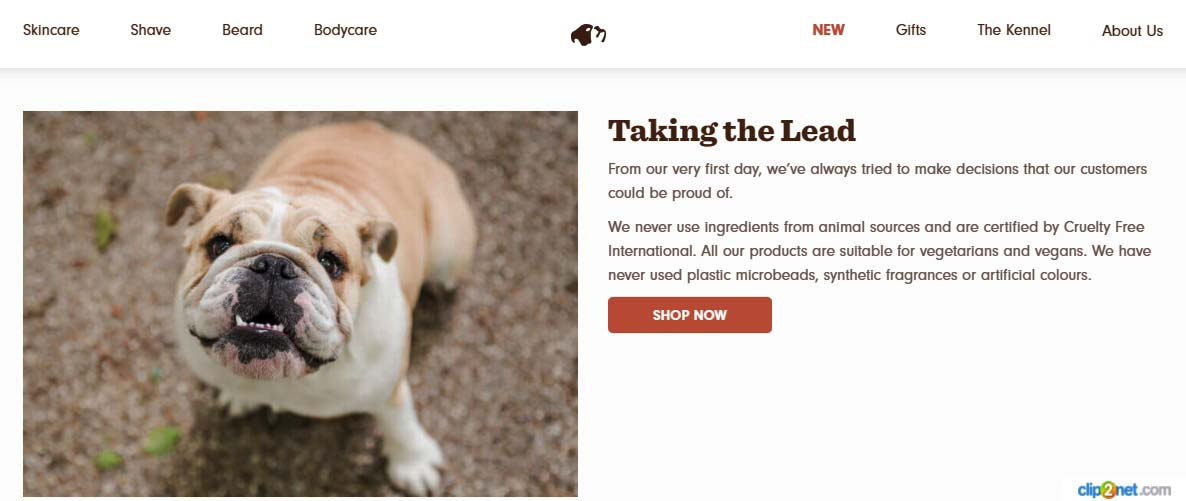 Bulldog Skincare предлагает средства по уходу за кожей для мужчин. Здесь прекрасно все - бульдог, символизирующий мужчин, структура сайта и сами товары. Они настолько хороши, что вас не будут раздражать даже призывы “Купить”, появляющиеся на каждом шагу.