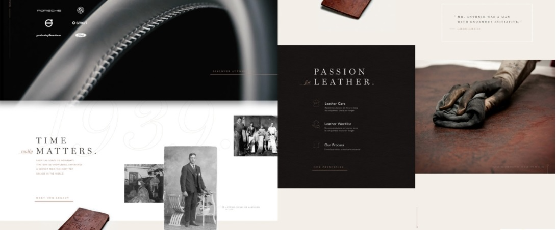 Компания основана в 1904 году. Производит кожаную обивку для автомобилей, поездов и самолетов. Сейчас здесь работает более 450 человек. Всю эту информацию, а также историю компании, вы найдете в разделе “О нас”. На странице прекрасно сочетаются суперсовременные технологии с элементами ретро. Выполнено на очень высоком уровне.