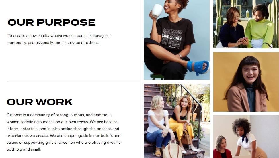 Страница “О нас” - “классическая классика”. Как завещали в учебниках по маркетингу - миссия, цель, ценности и чем занимаются. С хорошими фотографиями, добротным дизайном и легкой подачей. Раздел ничем не удивляет, но краткие тезисы, иногда с элементами юмора, дают полное представление, чем может быть полезно сообщество Girlboss. Здесь все доступно и понятно.