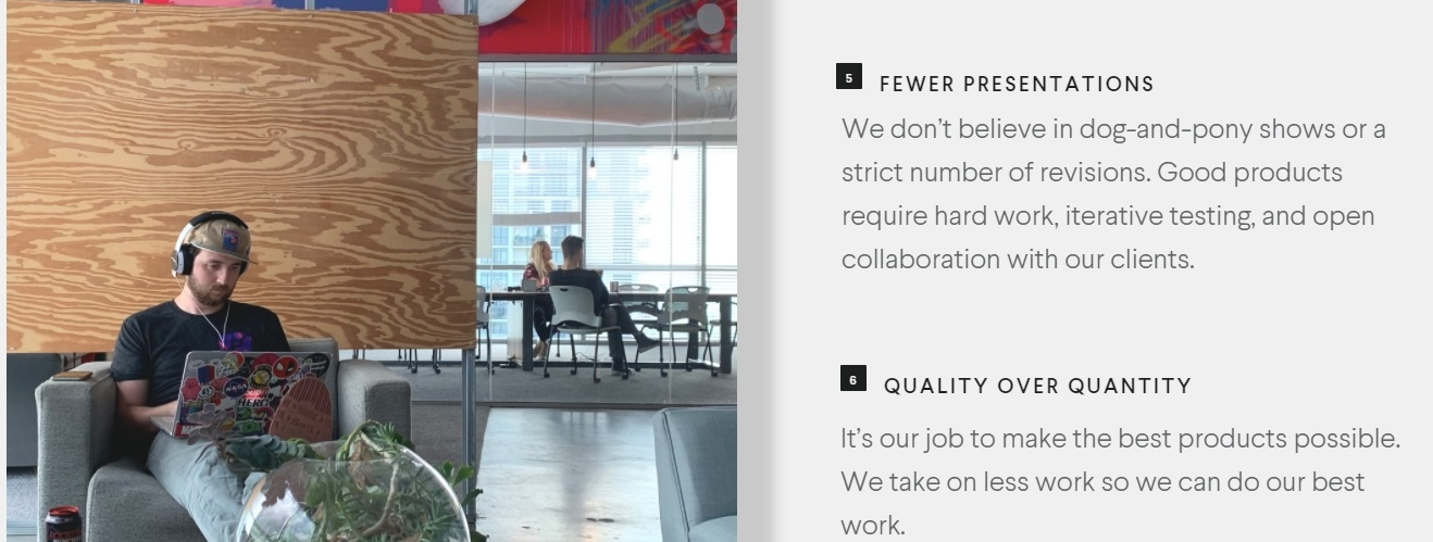 Прекрасно вписался в интерьер пес, что еще раз демонстрирует дружелюбность. И, естественно, есть ссылки на заслуги и процесс работы. Все на этой странице показывает, что с этими ребятами приятно работать.
