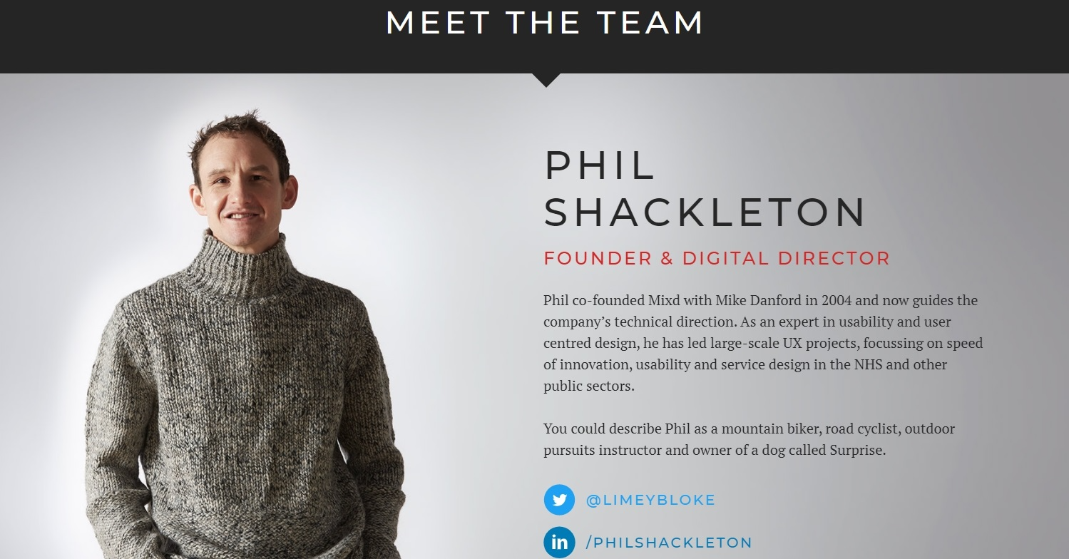 Редко можно встретить страницу “О компании”, в которой так много внимания уделяется знакомству с командой. Каждый человек изображен с кратким описанием и снимком почти в полный рост вместе с их аккаунтами в соцсетях.