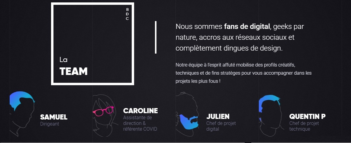 Интересная подача информации о команде в разделе “Наше агентство”. В стиле рисованной миниатюры с яркими деталями, которые раскрывают индивидуальность каждого сотрудника.
