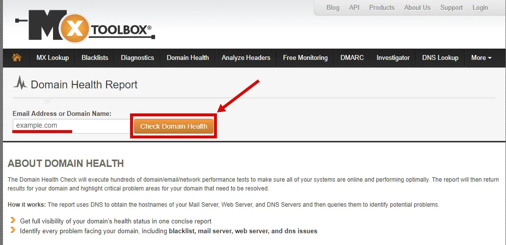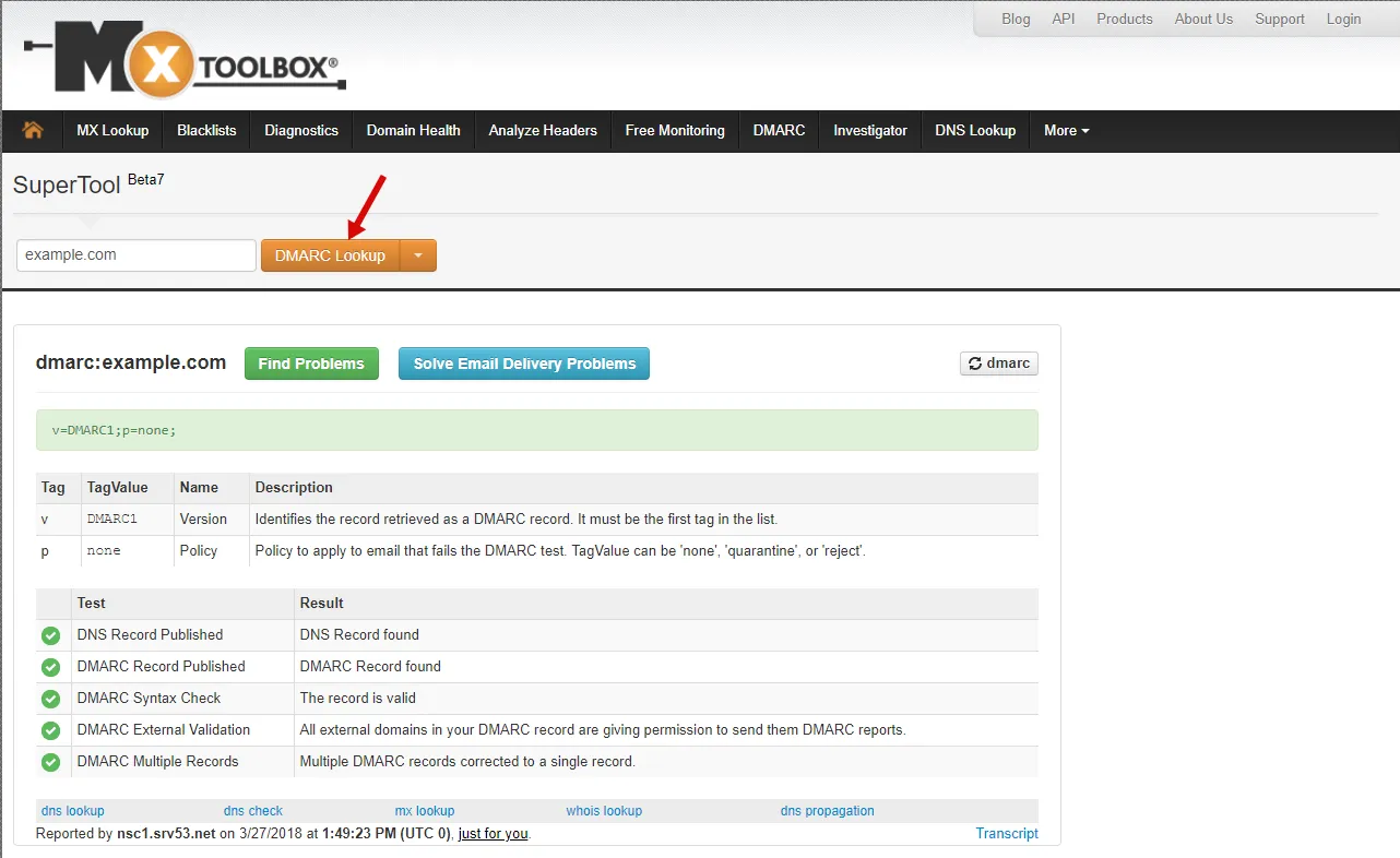 Mxtoolbox позволяет провести общую диагностику домена, обнаружить его наличие в черных списках, проверить корректность MX записей и других DNS записей, даже протестировать вероятность доставки ваших писем в Inbox. Проведенное вовремя тестирование позволит избежать проблем с почтовыми провайдерами.