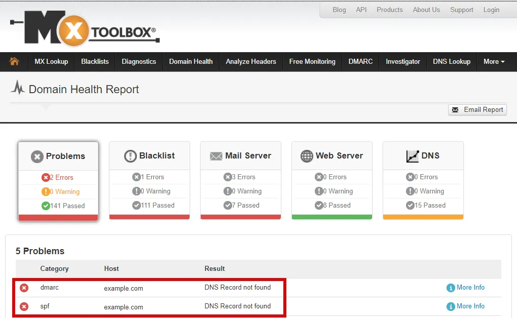 Домен здоров, если не будет выявлено проблем, обозначенных красным цветом. Но результат проведенной проверки показал наличие ошибок, которые необходимо устранить - отсутствие записей SPF и DMARC.