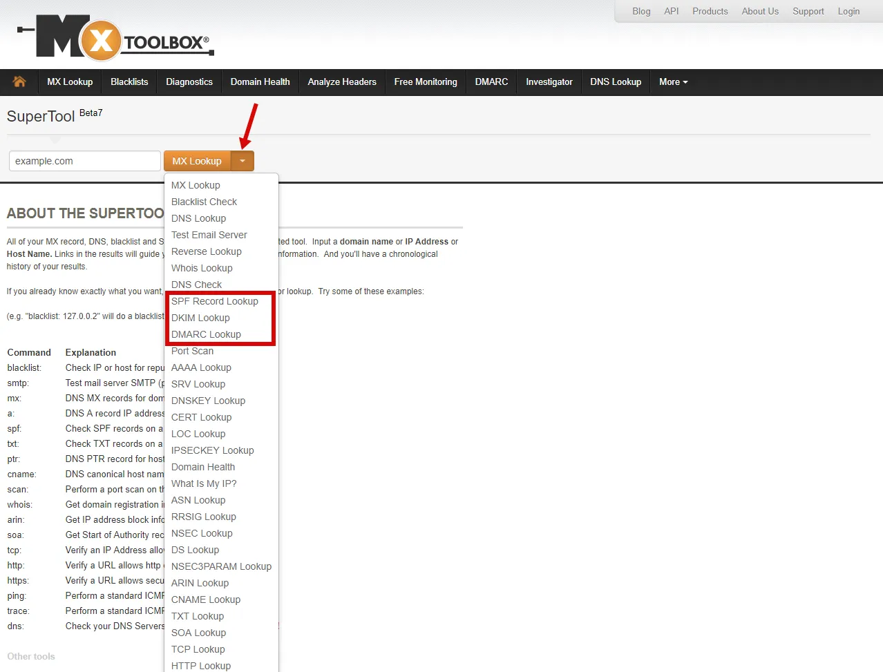 Кликаем на оранжевую кнопку со стрелкой. Из выпавшего списка нас интересуют SPF Record Lookup, DKIM Lookup и DMARC Lookup.