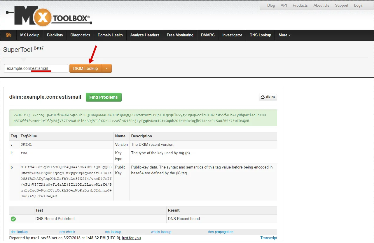 Введите домен в поле проверки в следующем формате - example.com:estismail. Вводить без http:// и www. Вместо example.com вписываете ваш домен, а после двоеточия укажите селектор. Выбираем DKIM Lookup.