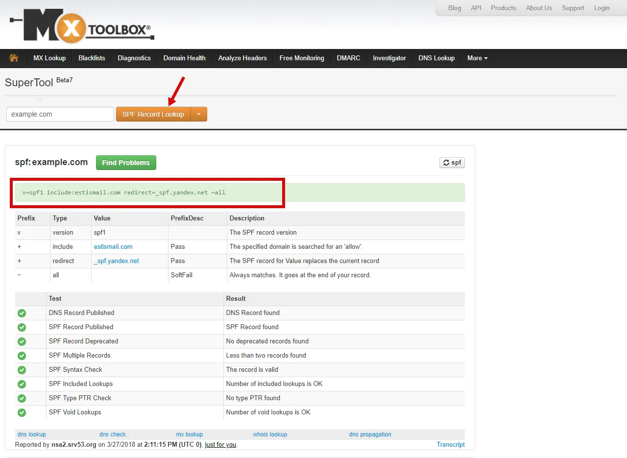 Проверка записи SPF, происходит так же, как и проверка DKIM. Из открывшегося списка выберите SPF Record lookup. В соответствующее поле введите имя домена без http:// и www. Если настройки корректны, увидите такую картину: