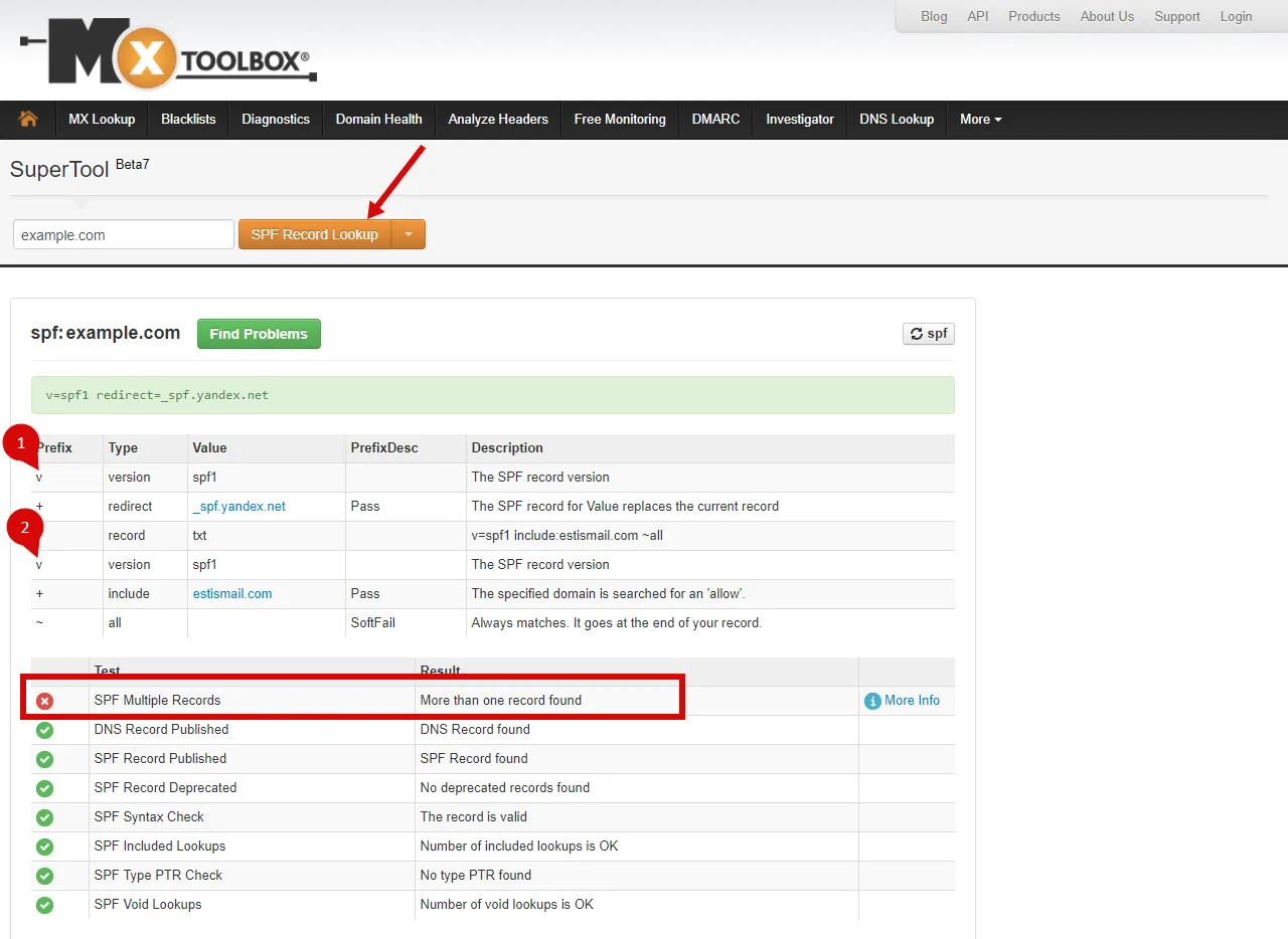 Самая распространенная ситуация, помимо отсутствия записи SPF, это наличие 2 и более записей SPF. Если допущена подобная ошибка, в открывшемся окне увидите следующее:
