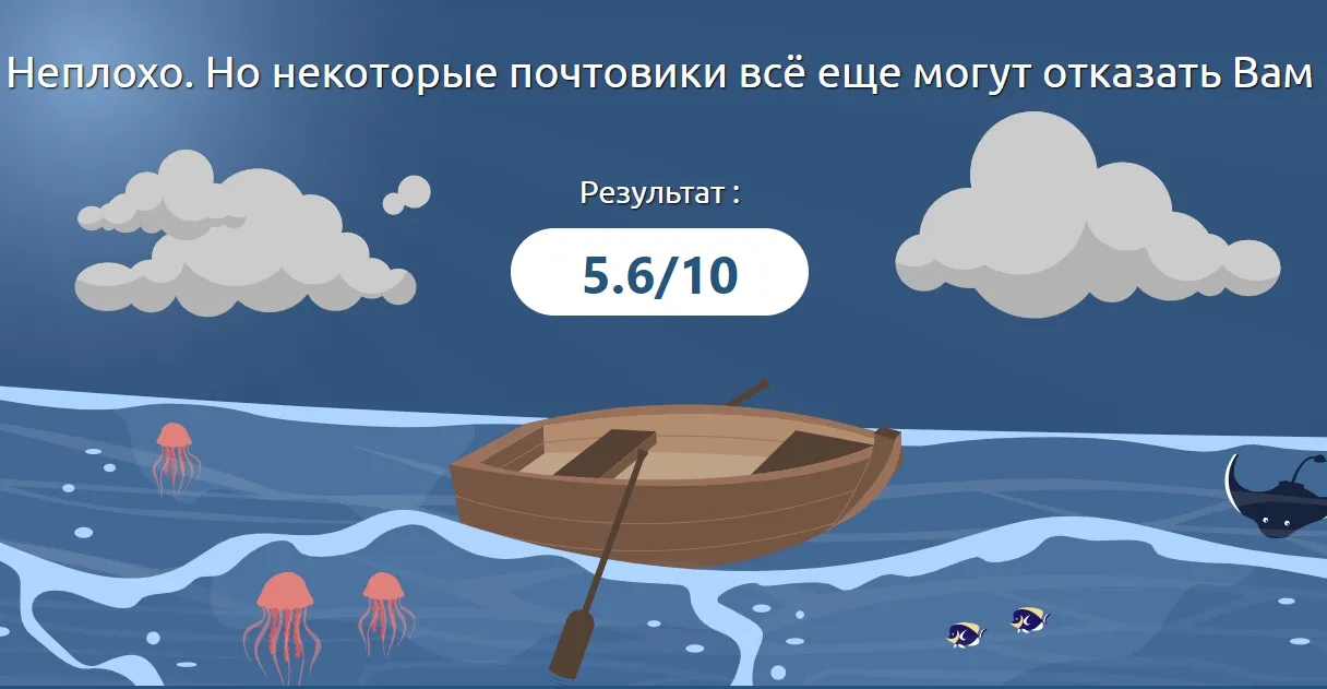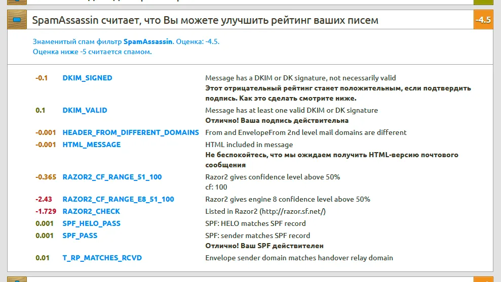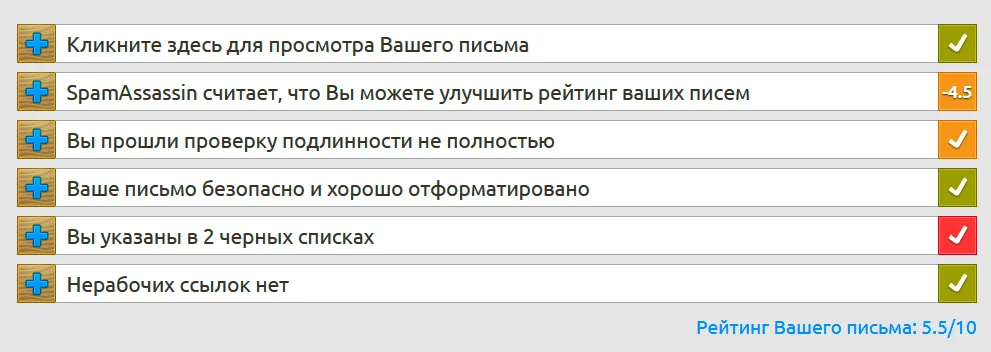 Письмо оценили в 5,5 баллов из 10. Это на грани спама. Меньше 5 баллов - явный спам, который почтовые сервисы отправляют в соответствующую папку или блокируют. Желательно, чтобы письма набирали больше 8 баллов, тогда у них есть шансы попасть в почтовый ящик получателя.