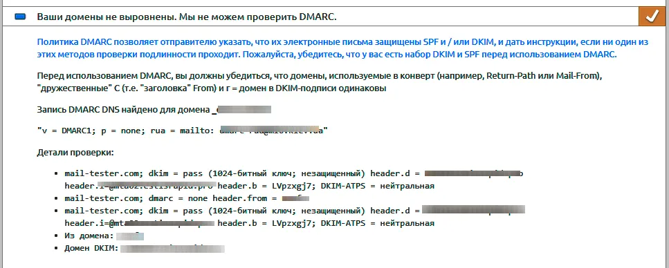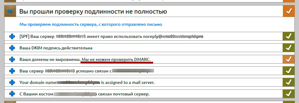 Единственный пункт, по которому сервер завалил экзамен - отсутствие DMARC идентификатора. В таблице он помечен оранжевым цветом.