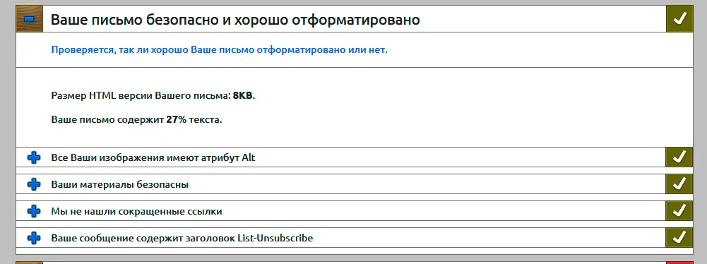 Этот раздел показал результаты проверки на наличие подписи DKIM и записи SPF. В нашем случае с ними все нормально. При отсутствии или некорректности SPF или DKIM, внесите соответствующие исправления, иначе письма не пройдут спам-фильтры.