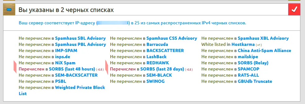 Mail-tester проверяет наличие IP в 25 распространенных черных списках. В нашем случае IP сервер, с которого отправлена рассылка, попал в 2 черных списках, что снижает шансы на попадание писем в инбокс.