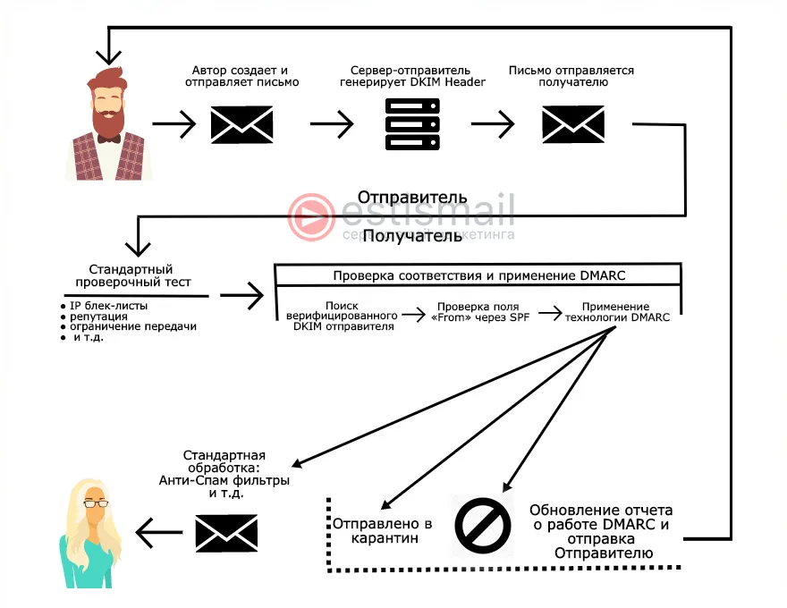 Вот как выглядит работа DMARC и весь процесс распознавания отправителя: