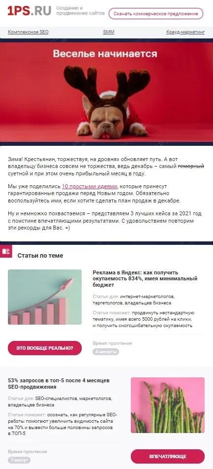 Компания 1PS.RU напоминает об идеях, которые увеличат продажи, делится лучшими кейсами за прошедший год и предлагает повторить эти рекорды для новых заказчиков. В письме хорошо уживаются полезности и ненавязчивая реклама.