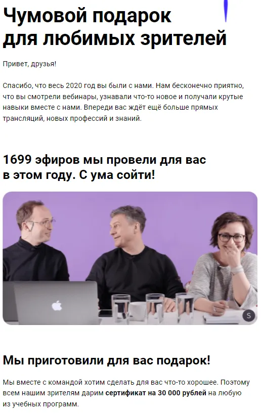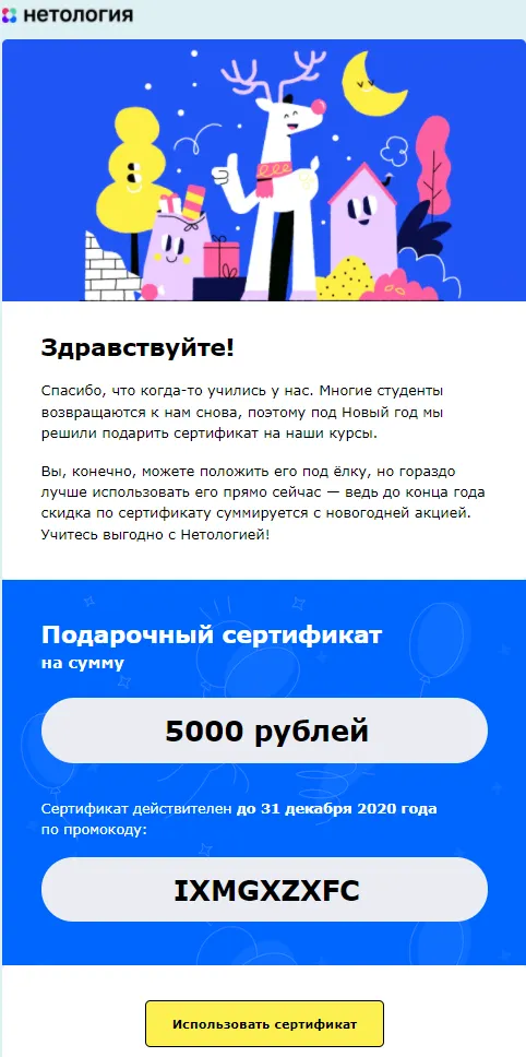 Еще один тип письма, уместный в рождественский период - признательность клиентам. Поблагодарите подписчиков за поддержку и за то что они с вами. Расскажите, что планируется в будущем году. И предложите какой-то подарок. Это покажет, насколько вы их цените. Skillbox предоставил в подарок сертификат на 30 000 рублей.
