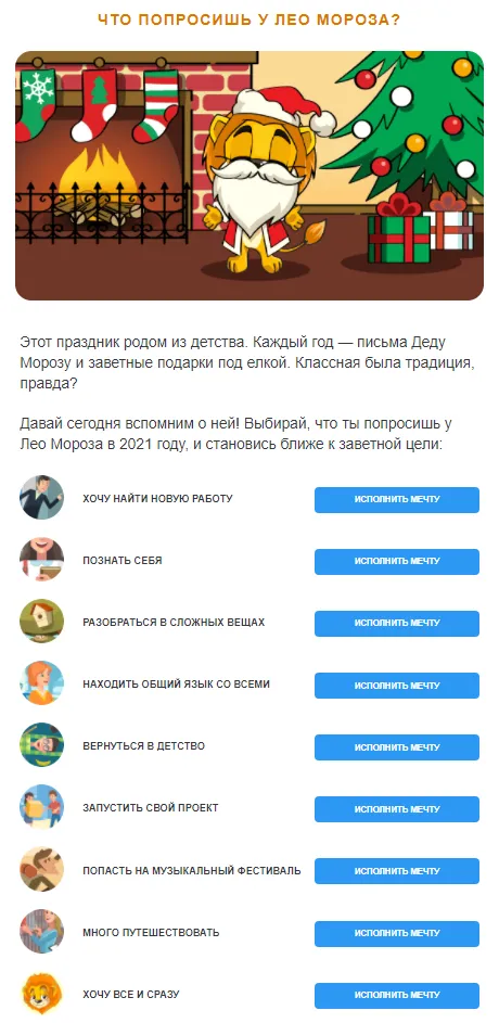 Воспользуйтесь идеей онлайн-курсов изучения иностранных языков Lingualeo. К новогоднему письму подошли креативно. Вместо стандартных скидок подписчикам предложили исполнить свою мечту.