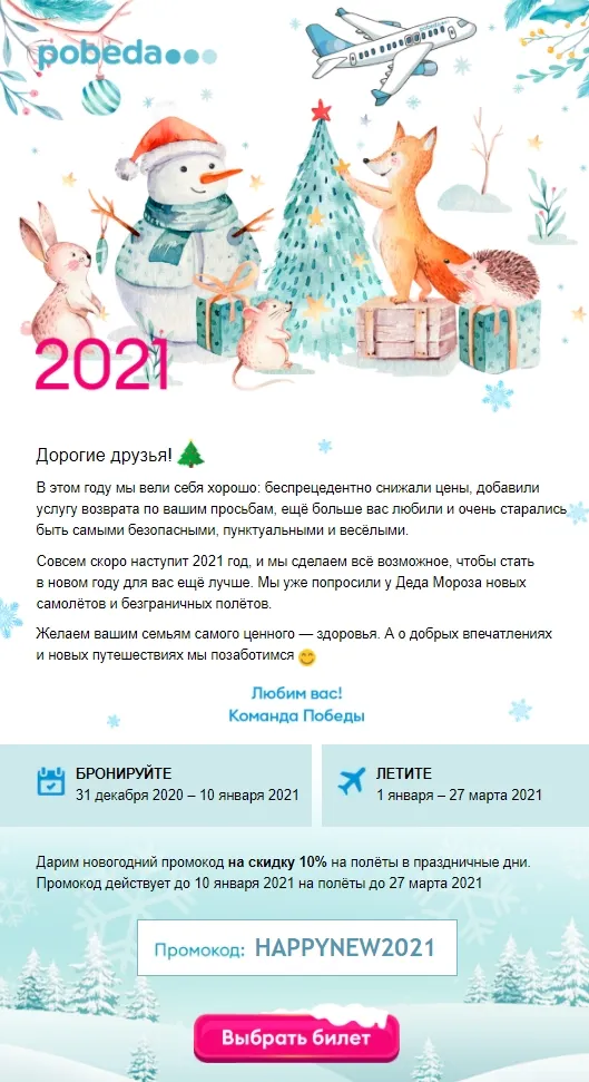 Сделайте письмо просто красивым, в зимнем стиле. Передайте волшебный дух предстоящих праздников, как это получилось у компании Победа.