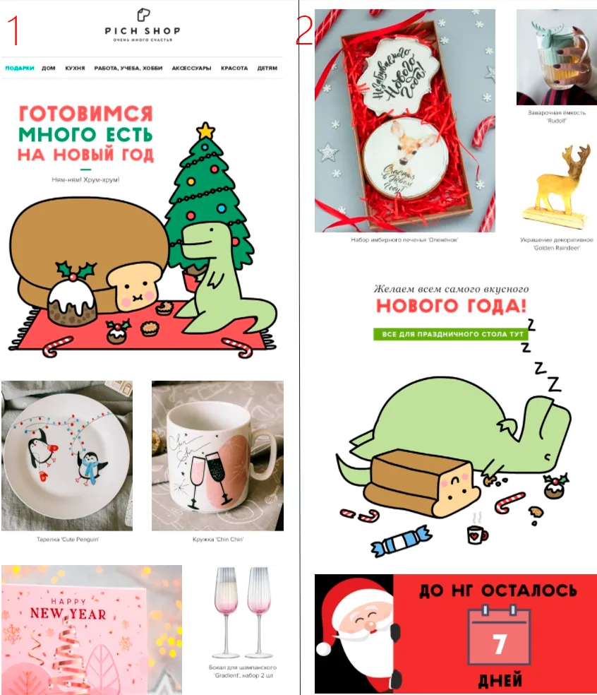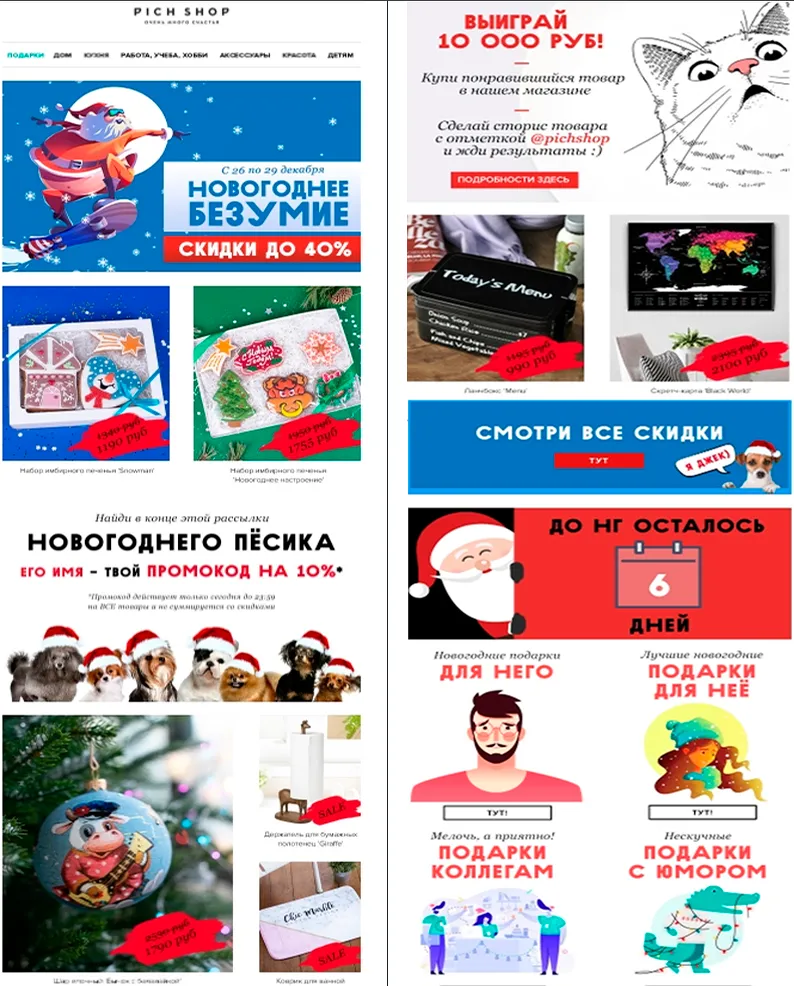Pich Shop это вполне удалось. Магазин ежедневно шлет письма с различными идеями подарков, веселым текстом и изображениями и указывает сколько дней осталось до Нового Года.