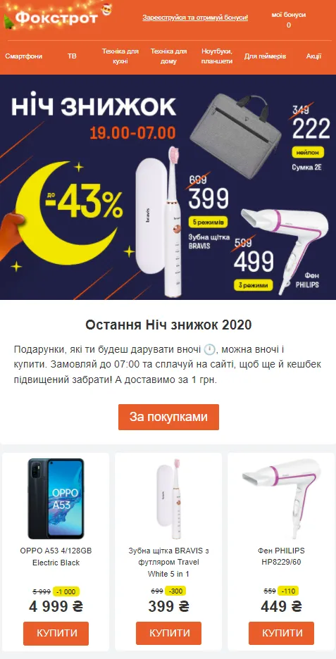 Придумайте необычную распродажу, например ночную. Интересно ее обыграйте, как это сделал магазин Фокстрот. В письме написано, что подарки которые вы будете дарить ночью, можно и купить ночью. И как бонус - доставка за 1 грн.