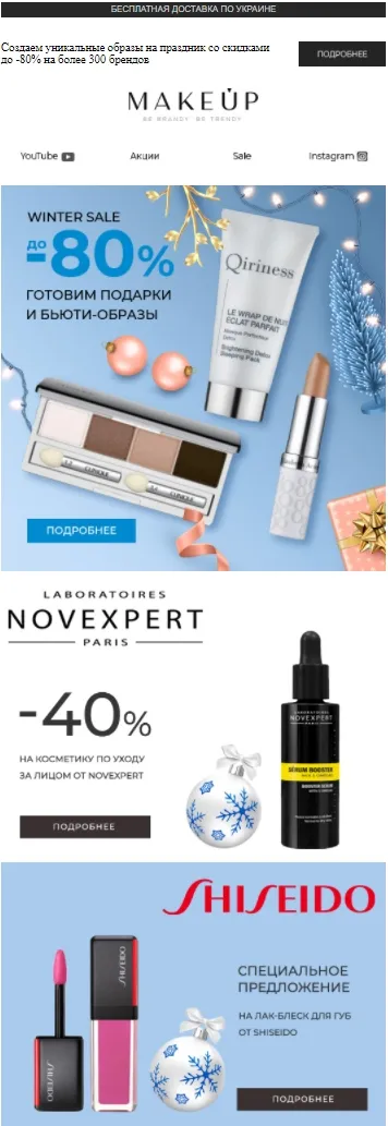 У Make Up все структурировано, красиво и понятно. Начинается письмо сообщением, что доставка бесплатная, затем идет ссылка на более 300 брендов со скидками. Ниже реклама отдельных товаров и брендов.