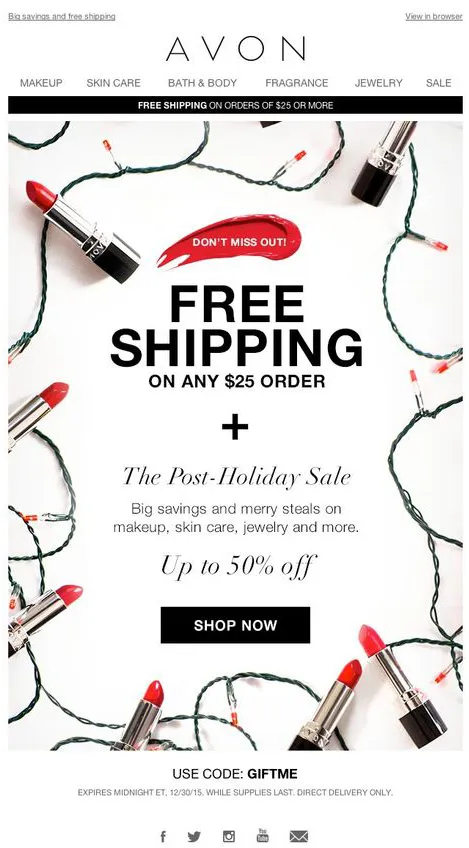 Компания Avon предложила своим клиентам скидки уже после всех праздников. Такой подход приятен покупателям и гарантирует дополнительный доход компании в мертвый послепраздничный сезон.