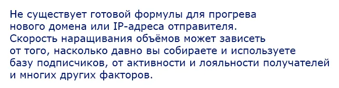 В емейл-маркетинге нет конкретных рекомендаций по разогреву домена. И сами почтовые провайдеры этого не скрывают. Mail.ru говорит это напрямую в Правилах рассылок: