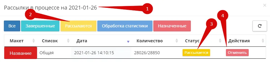 Чтобы остановить рассылку в сервисе Estismail необходимо зайти в раздел “Календарь рассылок”, нажать на текущую дату, затем перейти на вкладку “Рассылаются”. Нажмите кнопку “Отменить” напротив необходимой вам рассылки
