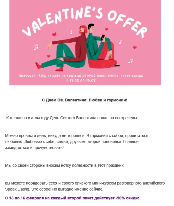 Курсы английского языка Let You Speak пригласили подписчиков на Speak Dating и предложили ко Дню святого Валентина скидку 50% на каждый второй продукт. Это еще раз доказывает, что к 14 февраля не обязательно продавать розы или шоколад, чтобы сделать хороший выторг. Тема их письма тоже привлекает внимание: "Самые продуктивные свидания, которые у вас когда-либо были".