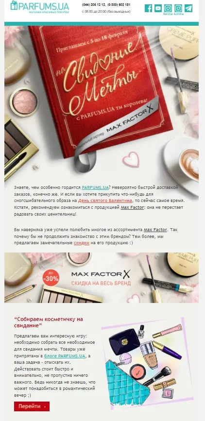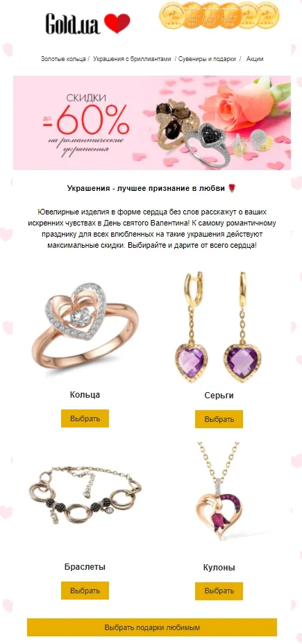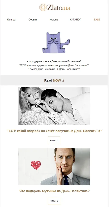 Пришло время запустить акцию! Маркетинговая кампания по случаю Дня влюбленных не должна быть сложной. В первой рассылке вы знакомите подписчиков с предложениями к празднику. Здесь также будет уместно выслать руководство по подаркам. Например, ювелирный интернет-магазин Zlato.ua подготовили советы, что можно подарить мужчинам и женщинам.