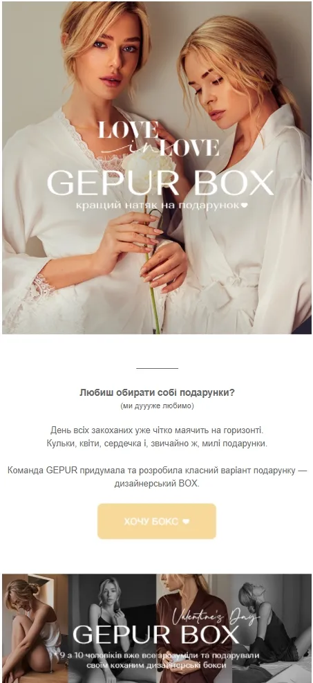 Рассылка от Gepur напоминает подписчикам, что для покупки подарков осталось мало времени. Они предлагают приобрести готовый набор - дизайнерский Box, чтобы даже самые забывчивые и нерешительные легко определились с подарками и успели к празднику.