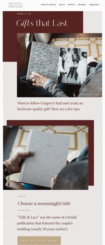 Ниже пример маркетинговой кампании, в которой использовалась сегментация по возрасту. Контактам, которые предположительно старше 50 лет, отправили предложение приобрести альбомы для фотографий и воспоминаний. Но тут, главное, не ошибиться с возрастом.