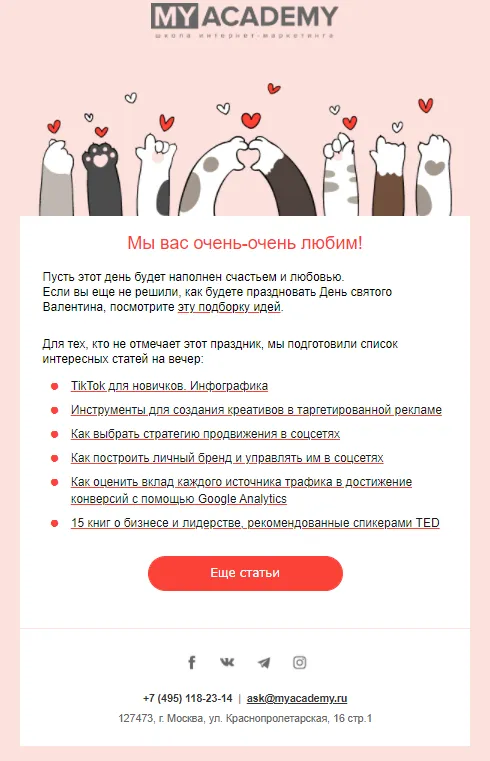 Школа интернет маркетинга My Academy сделала рассылку с признанием в любви своим подписчикам. В письме также есть подборка идей, как отпраздновать 14 февраля. А для тех, кто его не отмечает, советует провести время с пользой, рекомендуя статьи из своего блога. У них получилось одним письмом охватить все категории своих подписчиков.