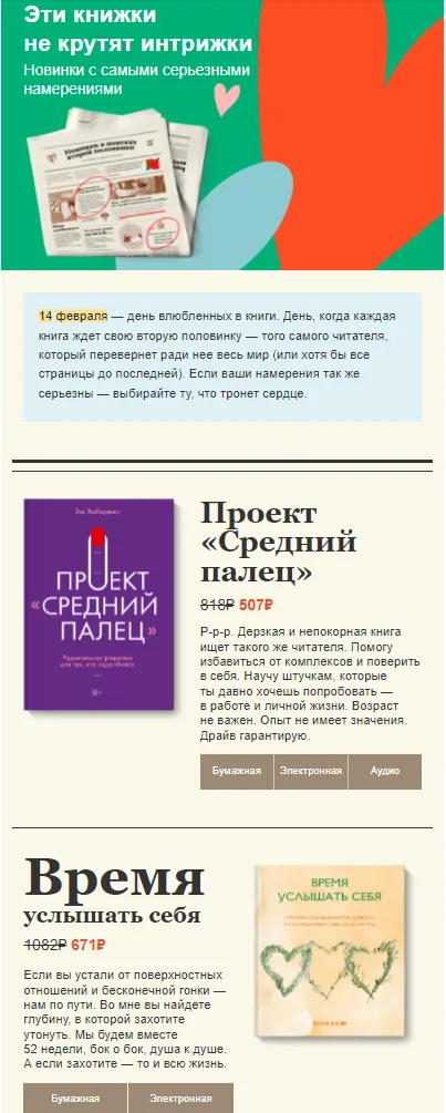 Еще один пример рассылки на 14 февраля, которая подойдет для всех. Издательство МИФ объявило его Днем влюбленных в книги. И предложило найти каждой из новинок вторую половинку - своего читателя.