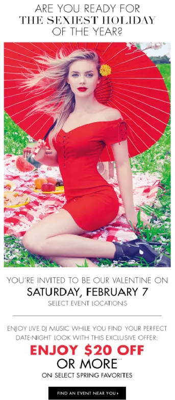 Guess также выбрал удачный момент для своего мероприятия - за неделю до Дня святого Валентина. Чтобы покупатели успели выбрать подходящий наряд к празднику. В письме на первый план вынесен вопрос: “Вы готовы к самому сексуальному празднику года?”