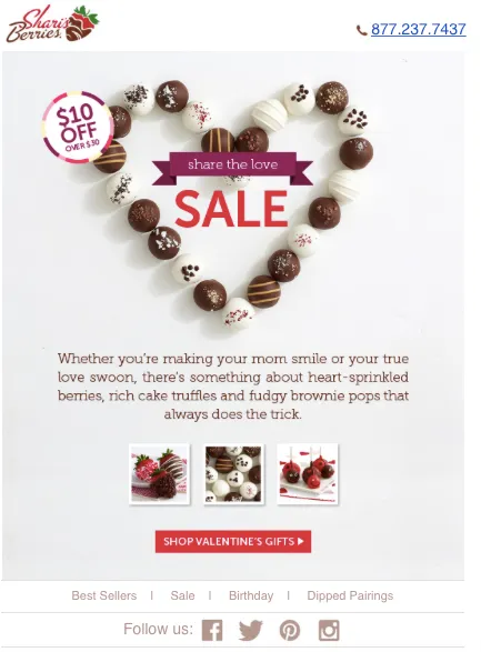 Компания Shari's Berries занимается продажей конфет и других сладостей. Клиенты могут заказать доставку шоколада и фруктов в шоколаде для своих близких к празднику. Они подготовили милое письмо ко Дню святого Валентина.
