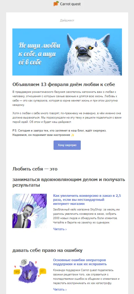 Carrot quest как всегда отличились оригинальностью и объявили 13 февраля Днем любви к себе. И сделали подборку соответственных статей из своего блога.