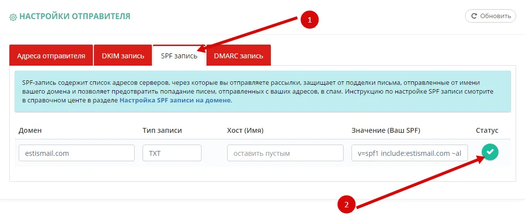 или в личном аккаунте почтового сервиса Estismail. Зеленая галочка в разделе “Статус” означает, что SPF прописана и внедрена в TXT - запись домена верно: