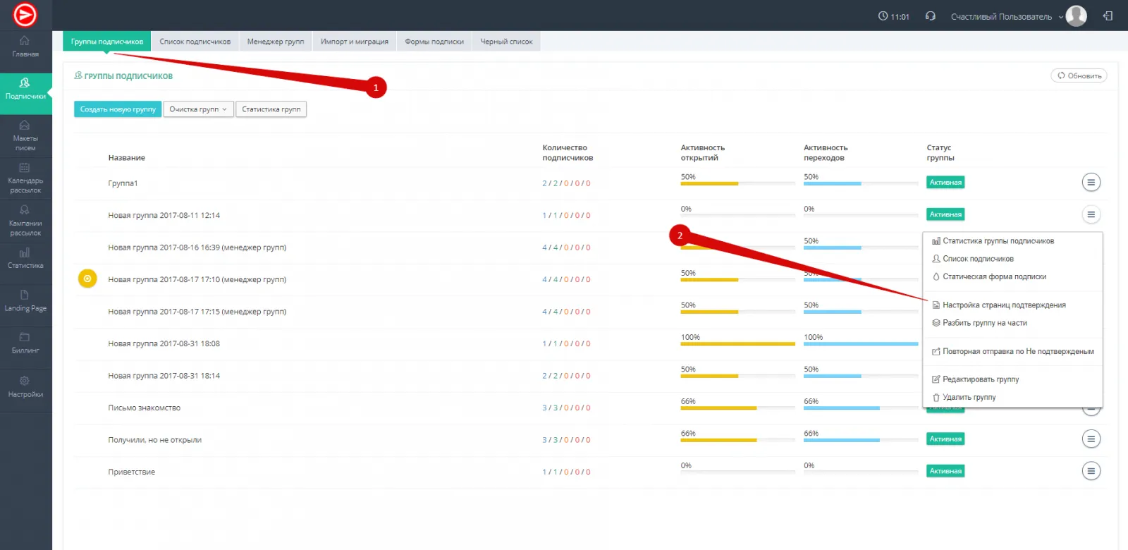 - Перейдите в раздел "Подписчики" вкладка "Группы подписчиков", напротив нужной группы, куда идет подписка, нажмите на кружочек с тремя полосками и выберите "Настройка страниц подтверждения" (рис. 1)