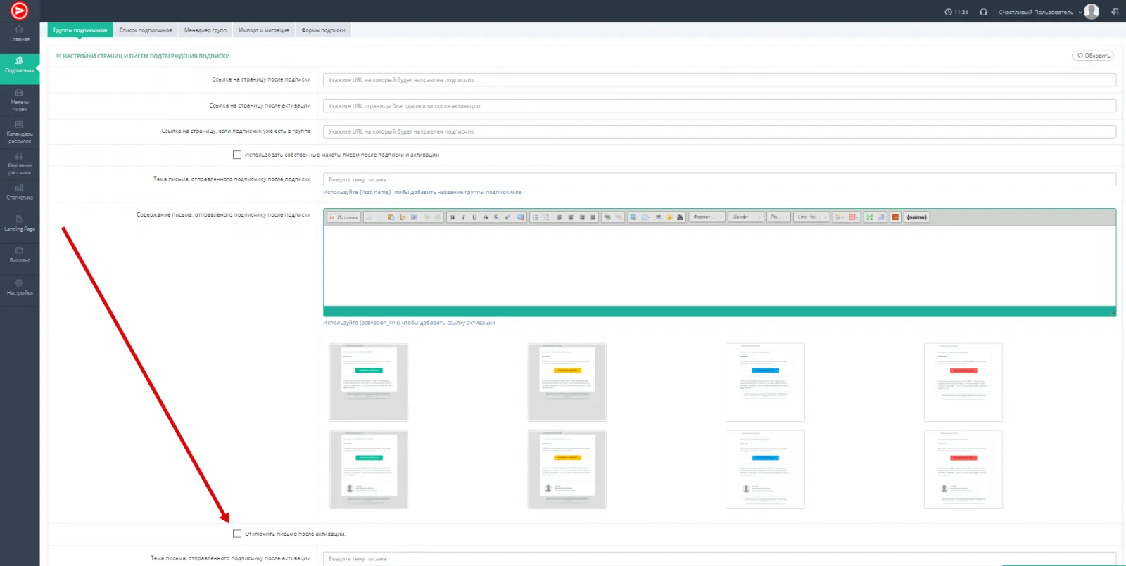 - Установите галочку "Отключить письмо после активации" и не забудьте нажать кнопку "Сохранить" (рис. 2)