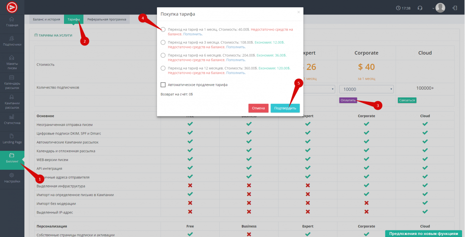 1. Найдите в личном кабинете раздел “Биллинг”, вкладка “Тарифы”;