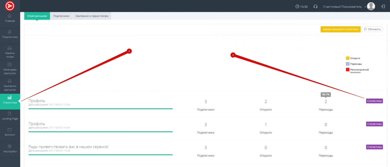 - Перейдите в раздел "Статистика рассылки" и выберите “Статистику” определенной рассылки. (рис.1)