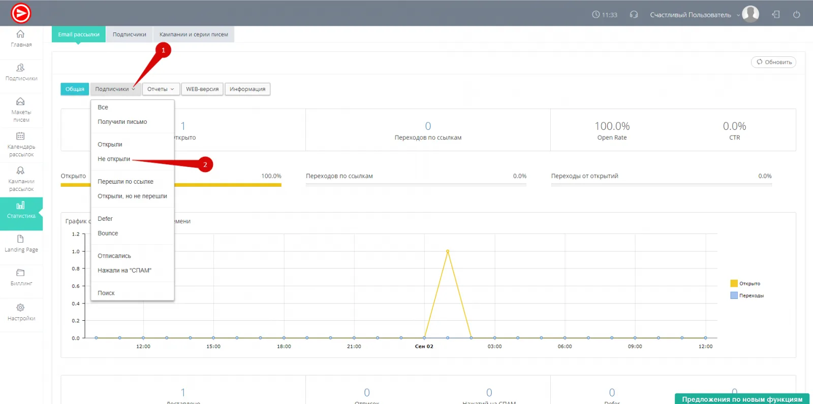 - Для сегментации подписчиков по действию необходимо выбрать нужную категорию из выпадающего списка “Подписчики” , например "Не открыли". (рис.2)